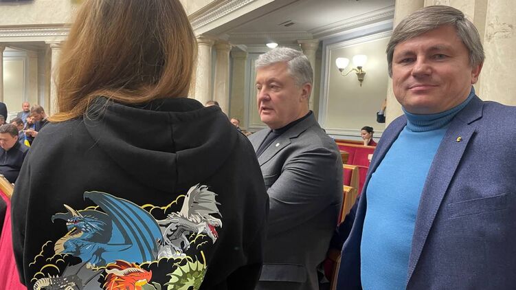 Партия "Евросолидарность" заявляет, что народный депутат Марьяна Безуглая в худи с драконами заняла место Петра Порошенко в зале Верховной Рады.