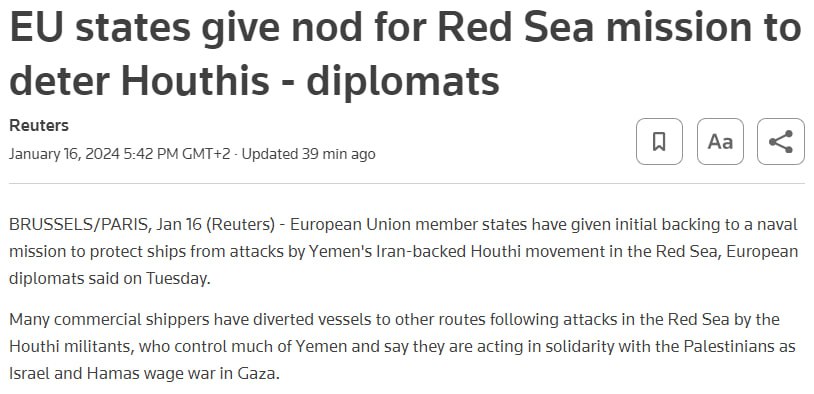 Между тем Евросоюз через месяц хочет направить военные корабли в Красное море, где хуситы обстреливают торговые суда. Об этом тоже сообщает Reuters со ссылкой на источники.