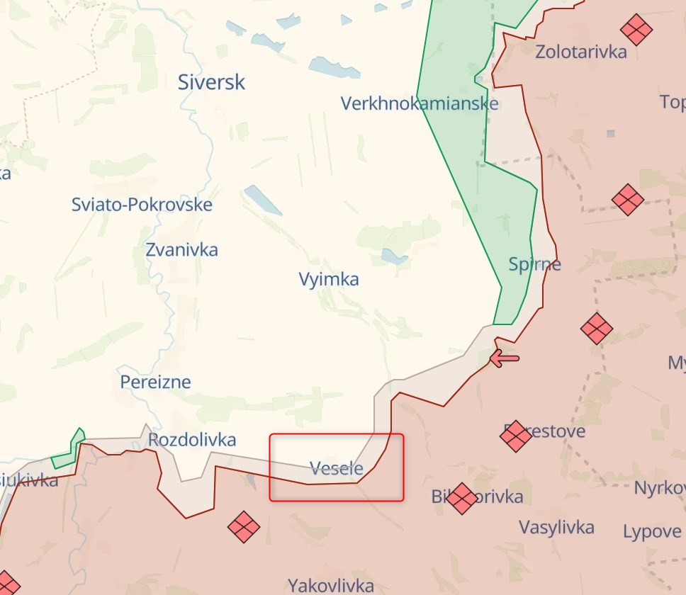 Украина захвата Веселого не подтверждала. Украинский телеграм-канал Deep State пишет, что за последние дни противник имел частичный успех у Белогоровки Луганской области. Это к востоку от Северска.