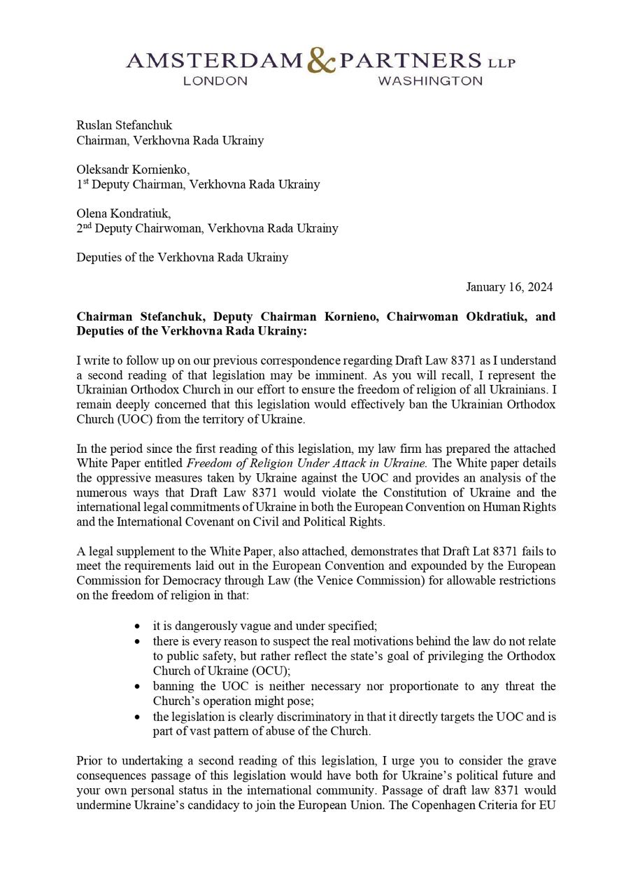 Ранее Роберт Амстердам направил депутатам Верховной Рады письмо, в котором заявил, что в случае голосования за законопроект о запрете УПЦ они могут подвергнуться уголовному преследованию в зарубежных странах.