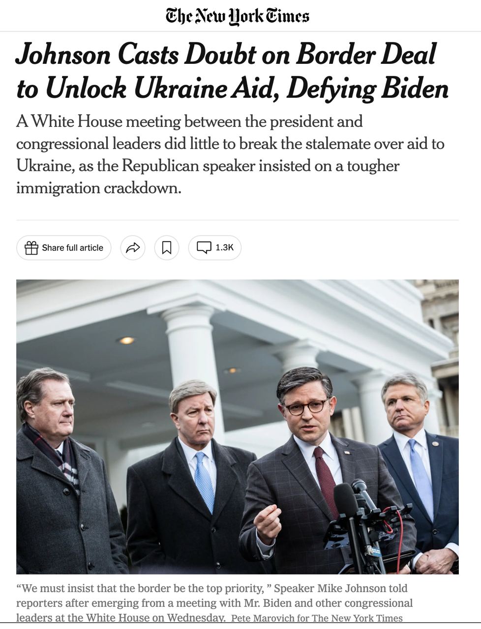 Вчера накануне этой встречи Джонсон заявил, что не намерен обсуждать с президентом выделение денег Украине, пока не будет решен вопрос с южной американской границей.