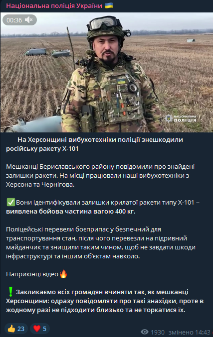 "Жители Бериславского района сообщили о найденных остатках ракеты. На месте работали наши взрывотехники из Херсона и Чернигова. Они идентифицировали остатки крылатой ракеты типа Х-101 – обнаружена боевая часть весом 400 кг" - говорится в сообщении.