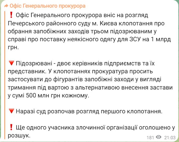 Отмечается, что подозреваемые, которым Офис генпрокурора требует ареста за поставки некачественной одежды для ВСУ – это два руководителя предприятий и их представитель.