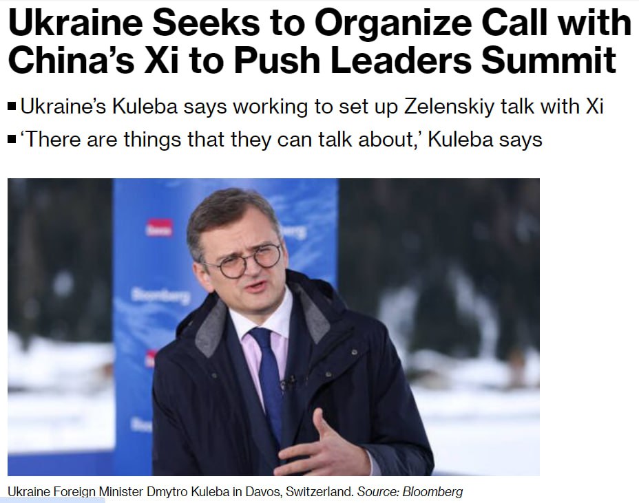 В публикации говорится, что министр иностранных дел Украины Дмитрий Кулеба, участвовавший во Всемирном экономическом форуме в Давосе, рассказал, что украинское правительство настаивает на установлении прямого канала связи между Си Цзиньпином и президентом Украины.