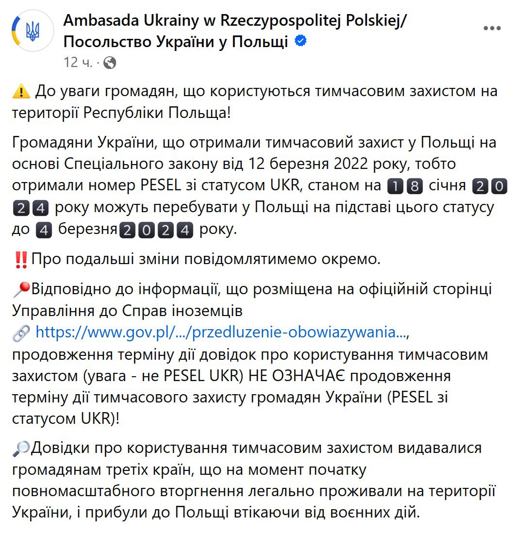 Однако посольство Украины в Польше эту информацию опровергло. По его данным, продление коснулось только граждан третьих стран (то есть не украинцев), которые жили в Украине на момент начала войны и бежали от боевых действий.