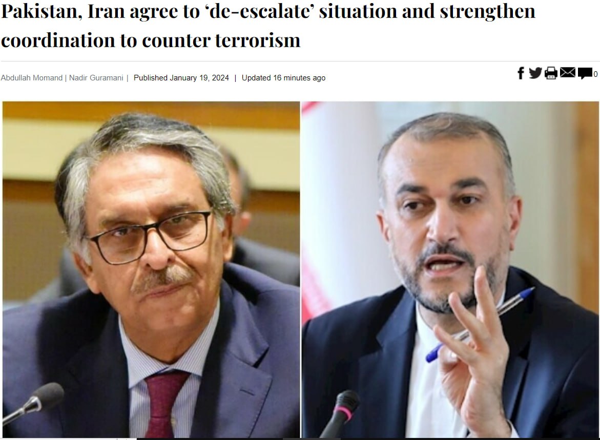 В публикации говорится, что Пакистан выразил желание работать с Ираном "на основе духа взаимного доверия и сотрудничества", поскольку две соседние страны согласились "деэскалировать ситуацию" и усилить координацию в борьбе с терроризмом.