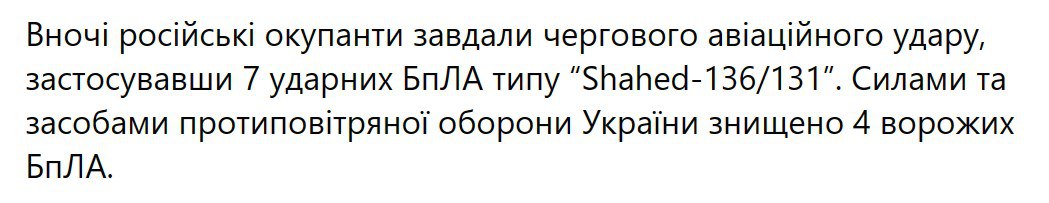 08:48 Ночью по Украине запустили семь "Шахедов", сообщает Генштаб ВСУ.