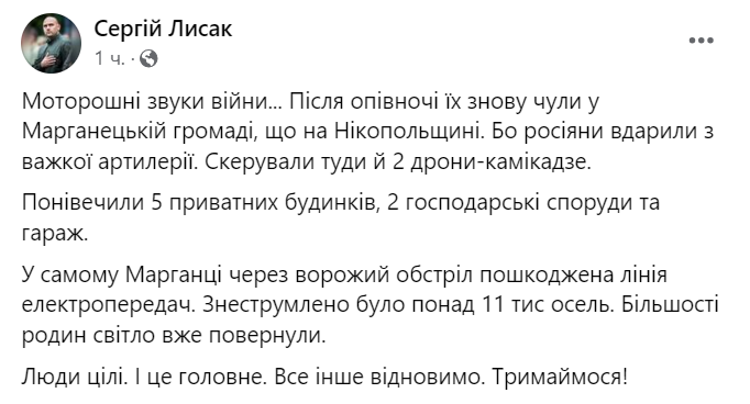Ночью россияне обстреляли из тяжелой артиллерии и атаковали дронами-камикадзе Марганецкую громаду Никопольского района. Повреждены жилые дома и линия электропередач.