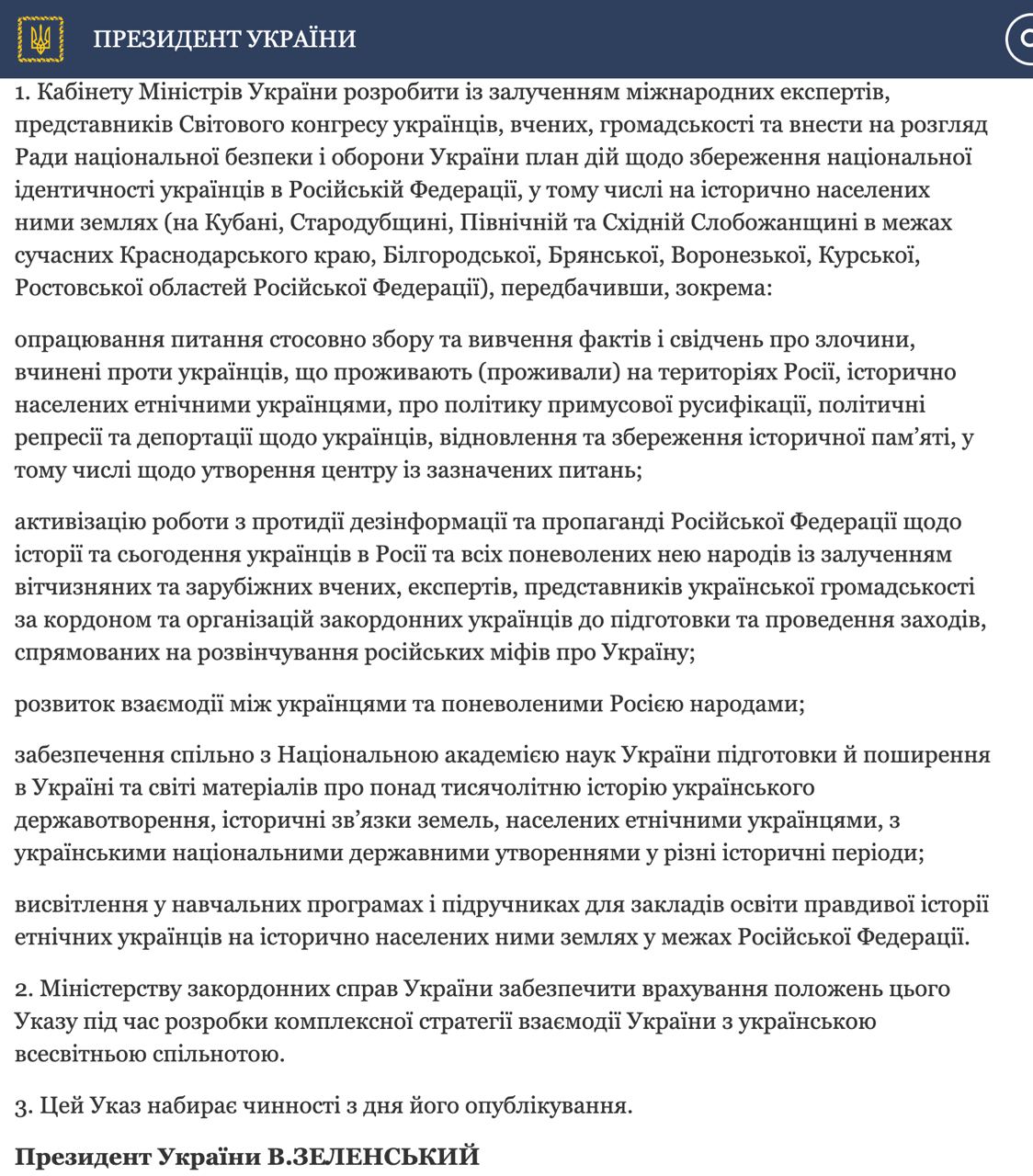 1. Кабинету Министров Украины разработать с привлечением международных экспертов, представителей Всемирного конгресса украинцев, ученых, общественности и внести на рассмотрение Совета национальной безопасности и обороны Украины план действий по сохранению национальной идентичности украинцев в Российской Федерации, в том числе исторически населенных ими землях (на Кубани, Стародубщине, Северной и Восточной Слобожанщине в пределах современных Краснодарского края, Белгородской, Брянской, Воронежской, Курской, Ростовской областей Российской Федерации), предусмотрев, в частности: