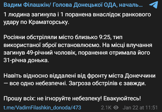 Сегодня утром российские войска обстреляли Краматорск. Один человек погиб, еще один получил ранения.