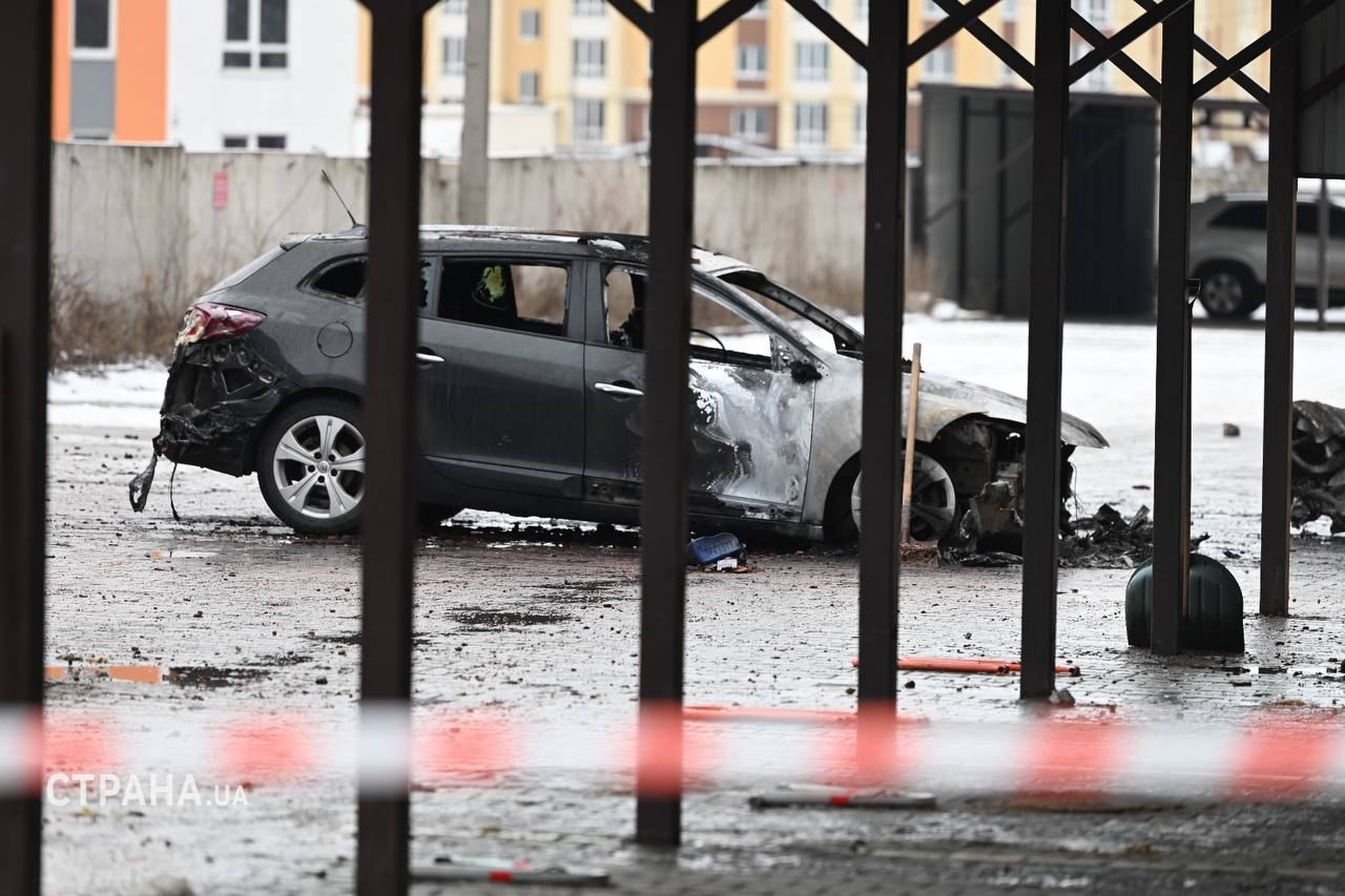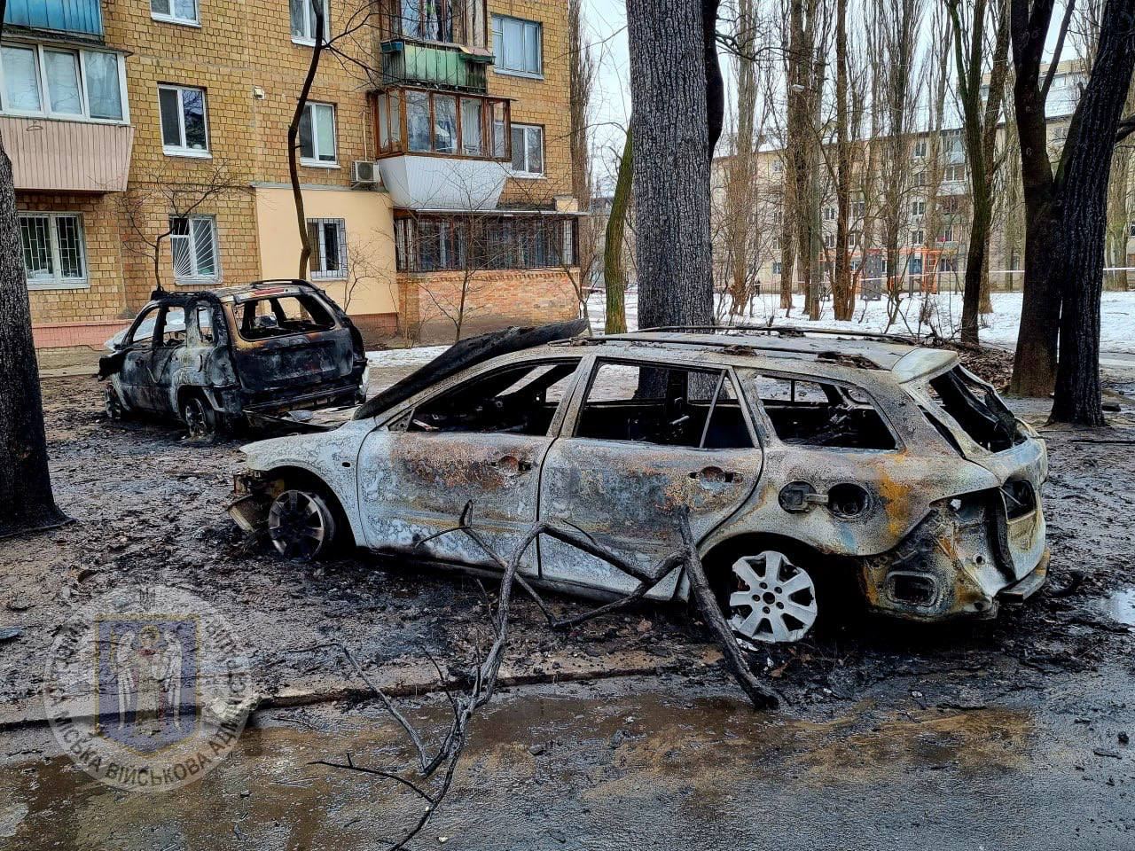 07.38 Горящие автомобили в Святошинском районе Киева после ракетной атаки.