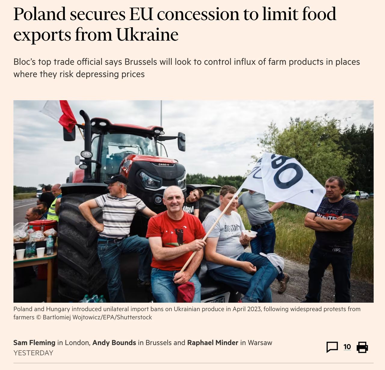 Польша добилась уступок от ЕС по ограничению экспорта украинской сельхозпродукции. Торговый комиссар ЕС Валдис Домбровскис заявил, что Брюссель начнет блокировать импорт из Украины, если рынок конкретной страны будет переполнен, что создаст риск снижения цен.