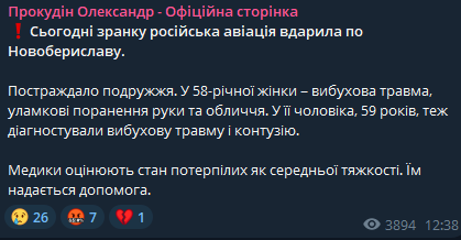 "Пострадали супруги. У 58-летней женщины – взрывная травма, обломочные ранения руки и лица. У ее супруга, 59 лет, тоже диагностировали взрывную травму и контузию", - говорится в сообщении.