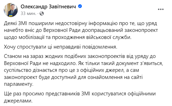 "По состоянию на сейчас никаких подобных законопроектов от правительства в Верховную Раду не поступало. Как только такой документ появится, общество узнает об этом из официальных источников, а сам законопроект будет доступен для ознакомления на сайте парламента", - заявил он.