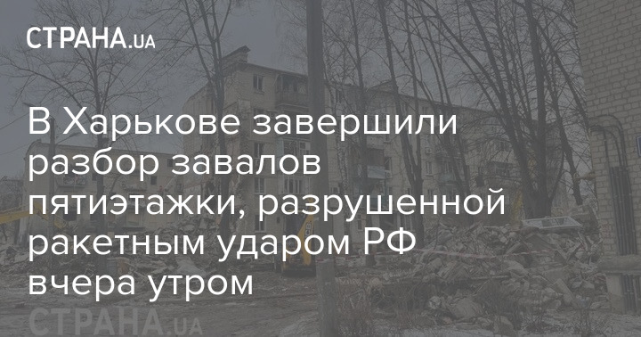 В Харькове завершили разбор завалов пятиэтажки, разрушенной ракетным ударом РФ вчера утром.