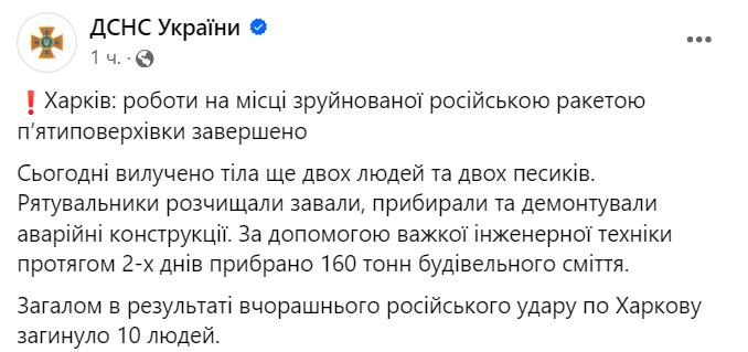 Всего в результате вчерашнего российского удара по Харькову погибли 10 человек.
