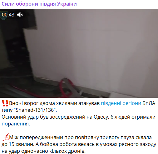 "К сожалению, сбитые дроны по инерционной траектории долетали до жилых кварталов. Один из них, попав в частично заселенную многоэтажную новостройку в Хаджибейском районе Одессы, вызвал пожар. Повреждены несколько квартир, один человек получил ожоги, госпитализирован.