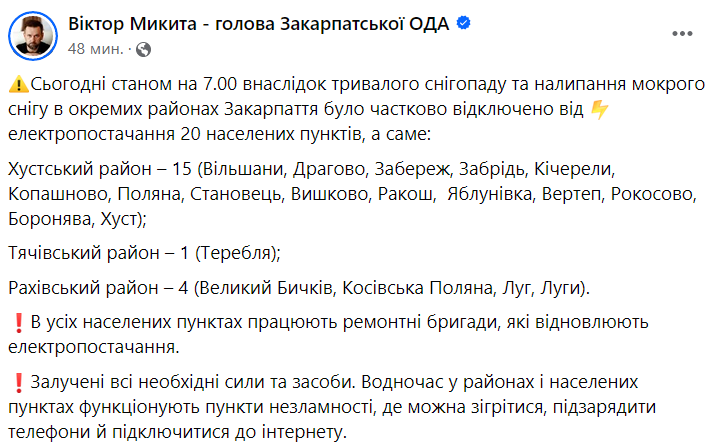 Отмечается, что по состоянию на утро 25 января из-за продолжительных снегопадов и налипания мокрого снега в Закарпатской области частично обесточены 20 населенных пунктов, из них: