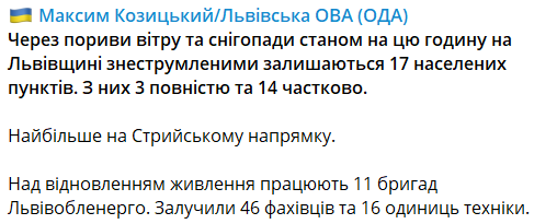 "Над восстановлением работают 11 бригад "Львовоблэнерго". Привлечены 46 специалистов и 16 единиц техники", - говорится в сообщении главы Львовской ОВА.