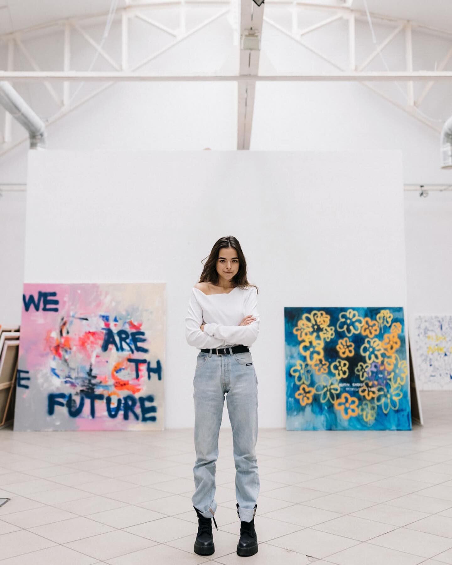 Однако это не единственный мурал Сони Морозюк в столице. Весной прошлого года на стене пятиэтажного жилого дома по улице Мечникова, 16 появилась еще одна работа художницы. На стенописи изображено сине-желтое полотно с надписью "Что круче, чем семья в 44 млн?"