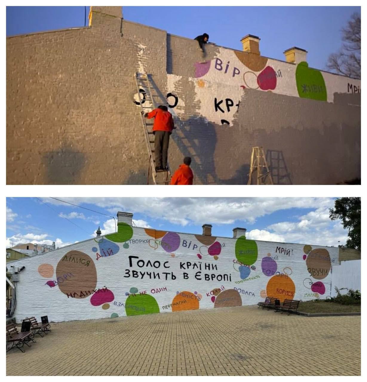 А именно - коммунальщики полностью закрасили настенную роспись художницы на здании, расположенном на Андреевском спуске. Через весь мурал была сделана крупная надпись: "Голос страны звучит в Европе".