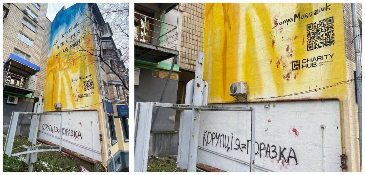 Недавно этот второй мурал облили красной краской и добавили надпись "Коррупция = поражение".