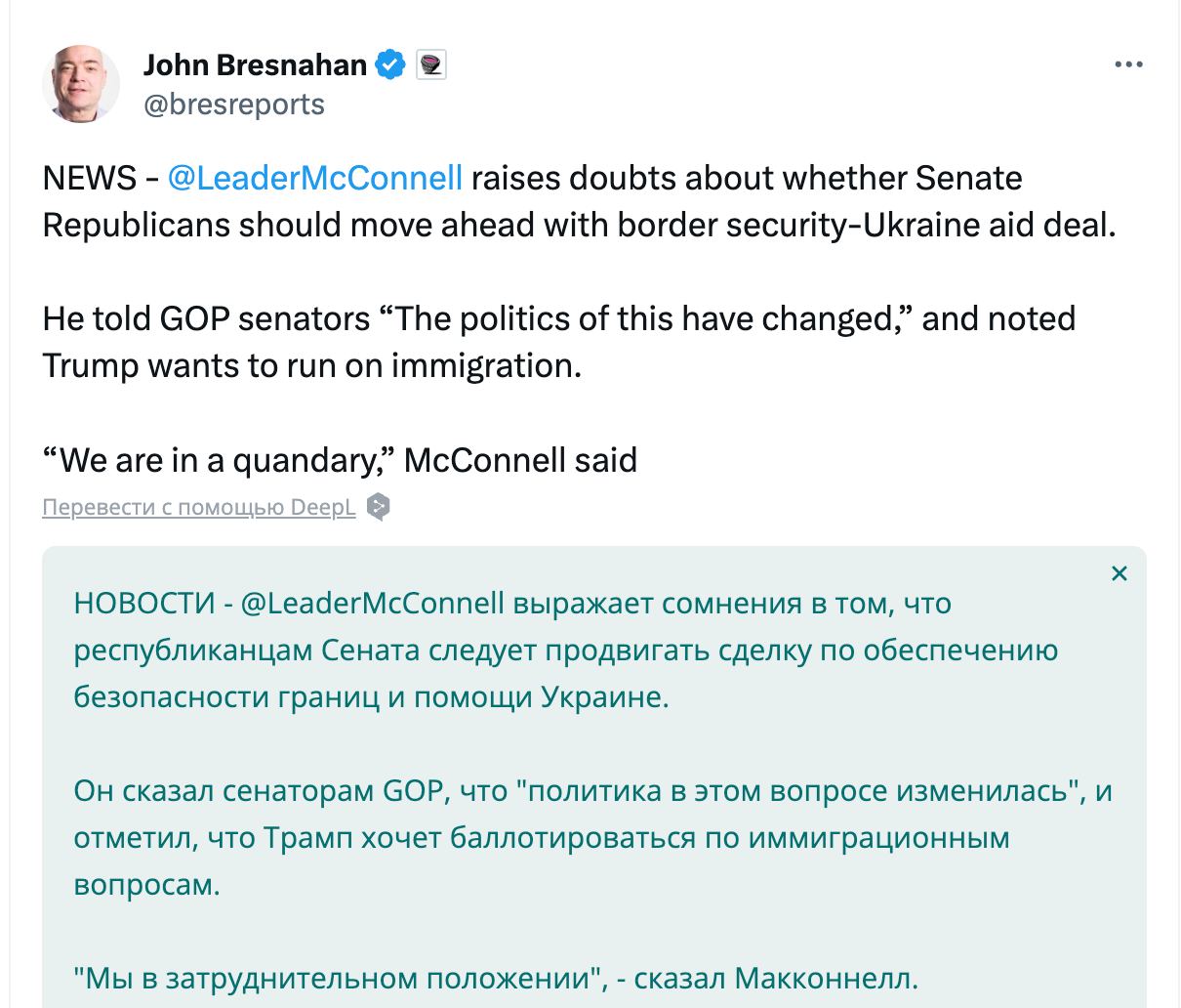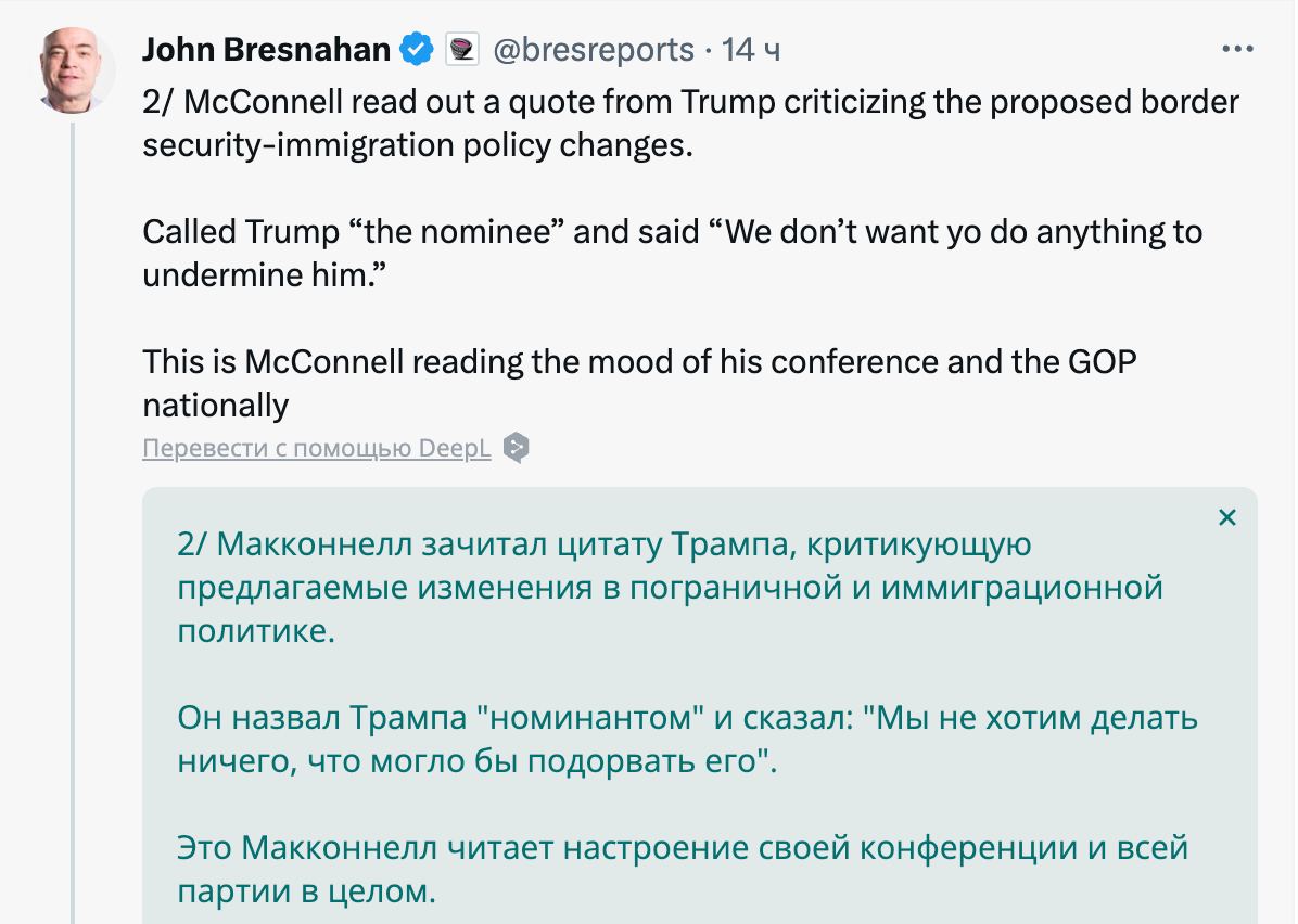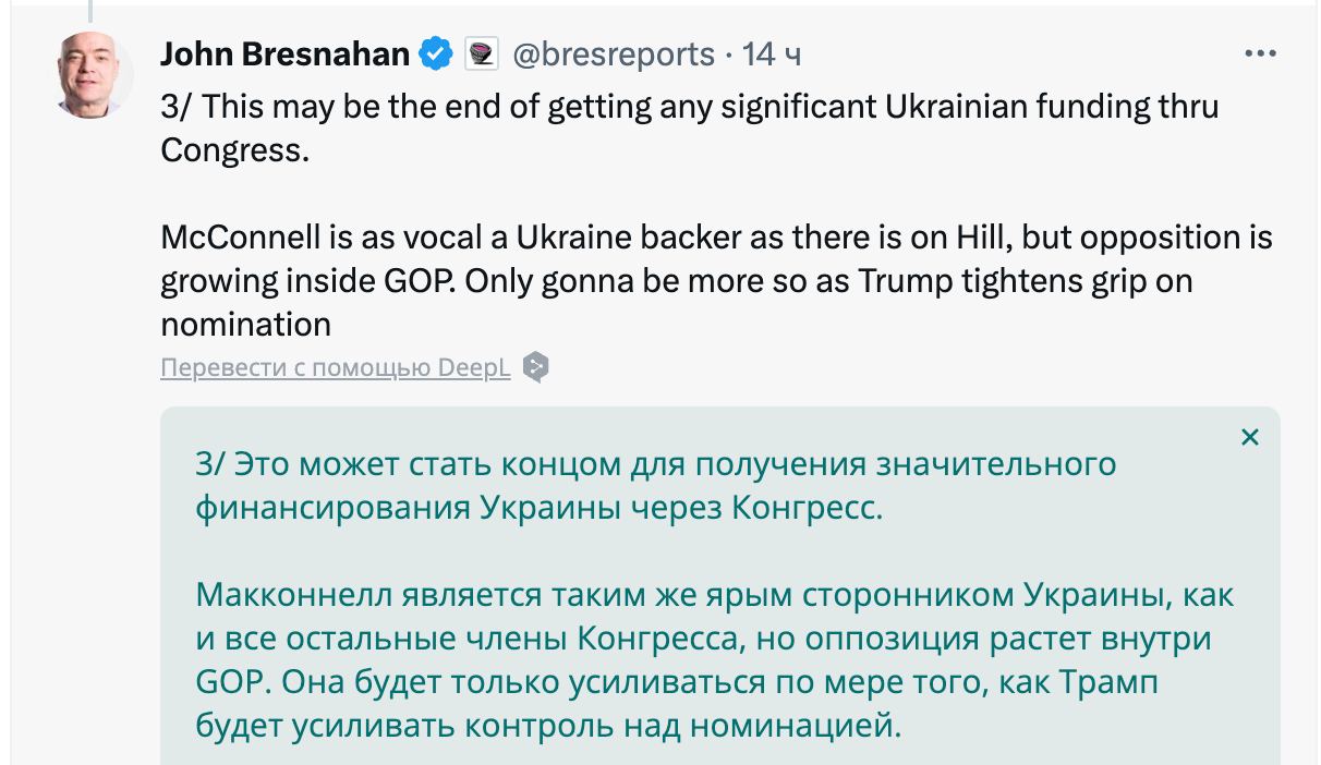 "Это может стать концом для получения значительного финансирования Украины через Конгресс. Макконнелл является таким же ярым сторонником Украины, как и все остальные члены Конгресса, но оппозиция растет внутри Республиканской партии. Она будет только усиливаться по мере того, как шансы Трампа стать кандидатом от республиканцев будут расти", - прокомментировал информацию сооснователь портала Punchbowl News Джон Бреснахан.