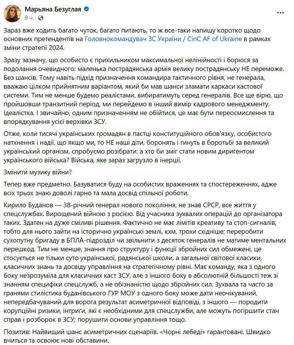 Депутат "Слуги народа" Марьяна Безуглая, которая с конца прошлого года критикует главкома ВСУ Валерия Залужного, высказала мнение, кто бы мог его заменить, намекая, что главкома могут заменить в рамках "смены стратегии-2024".