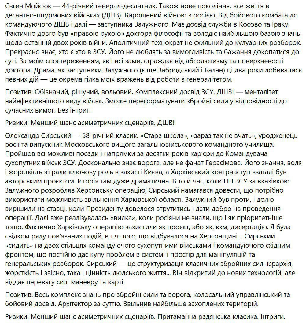 Она назвала три имени: главы ГУР Кирилла Буданова, Евгения Мойсюка, зама Залужного и бывшего командира десантных войск, и Александра Сырского, командующего Сухопутными войсками.
