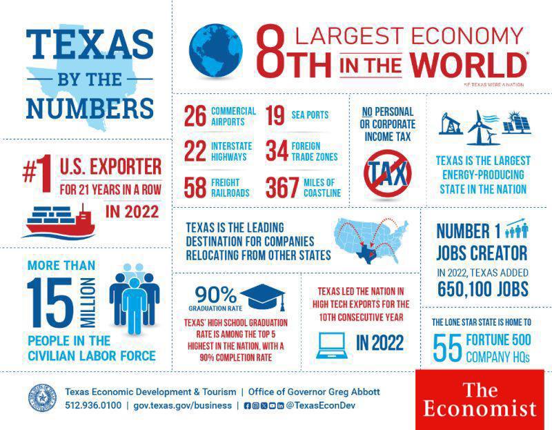 Если бы Техас был отдельной страной, то с ВВП 1,8 трлн долларов это будет 12-я экономика мира, которая бы обгоняла Южную Корею, Бразилию, Австралию, Россию, Испанию.
