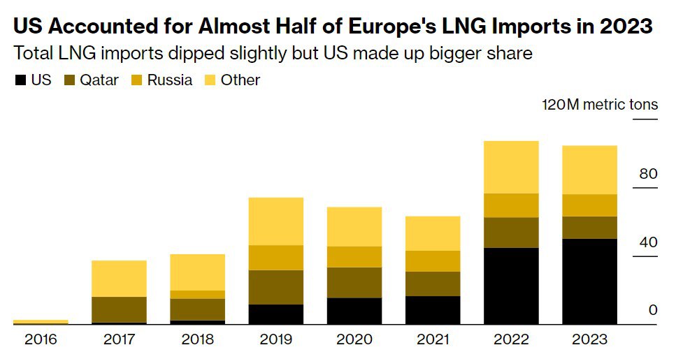При этом Брюсселю "стоило бы задуматься", поскольку "за очень короткий период США получили значительную долю поставок газа в Европу, затмив все оставшиеся поставки газа из России". Говорится о половине рынка Европы, который стали контролировать американцы.