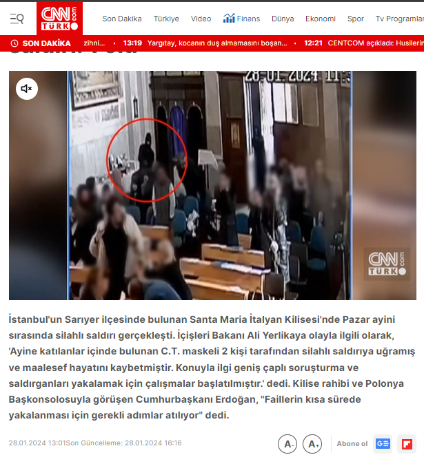 "Гражданин С. Т., находившийся во время молитвы в церкви Святой Марии в районе Сарьер, подвергся вооруженному нападению со стороны двух человек и, к сожалению, умер", - сказал глава МВД Турции Али Ерликая.