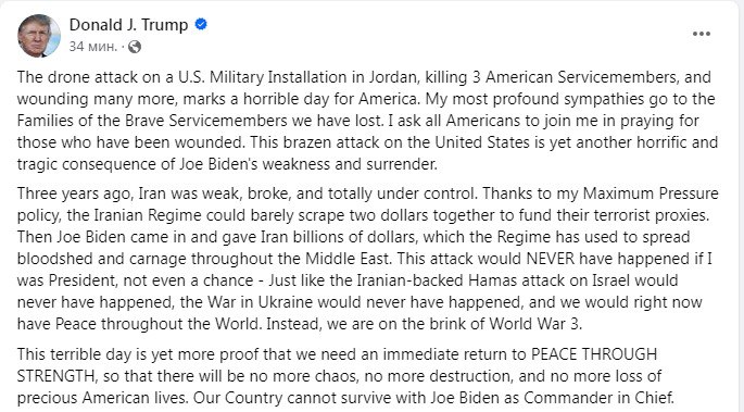 "Последствия слабости Байдена". Трамп прокомментировал атаку беспилотника на военную базу США в Иордании