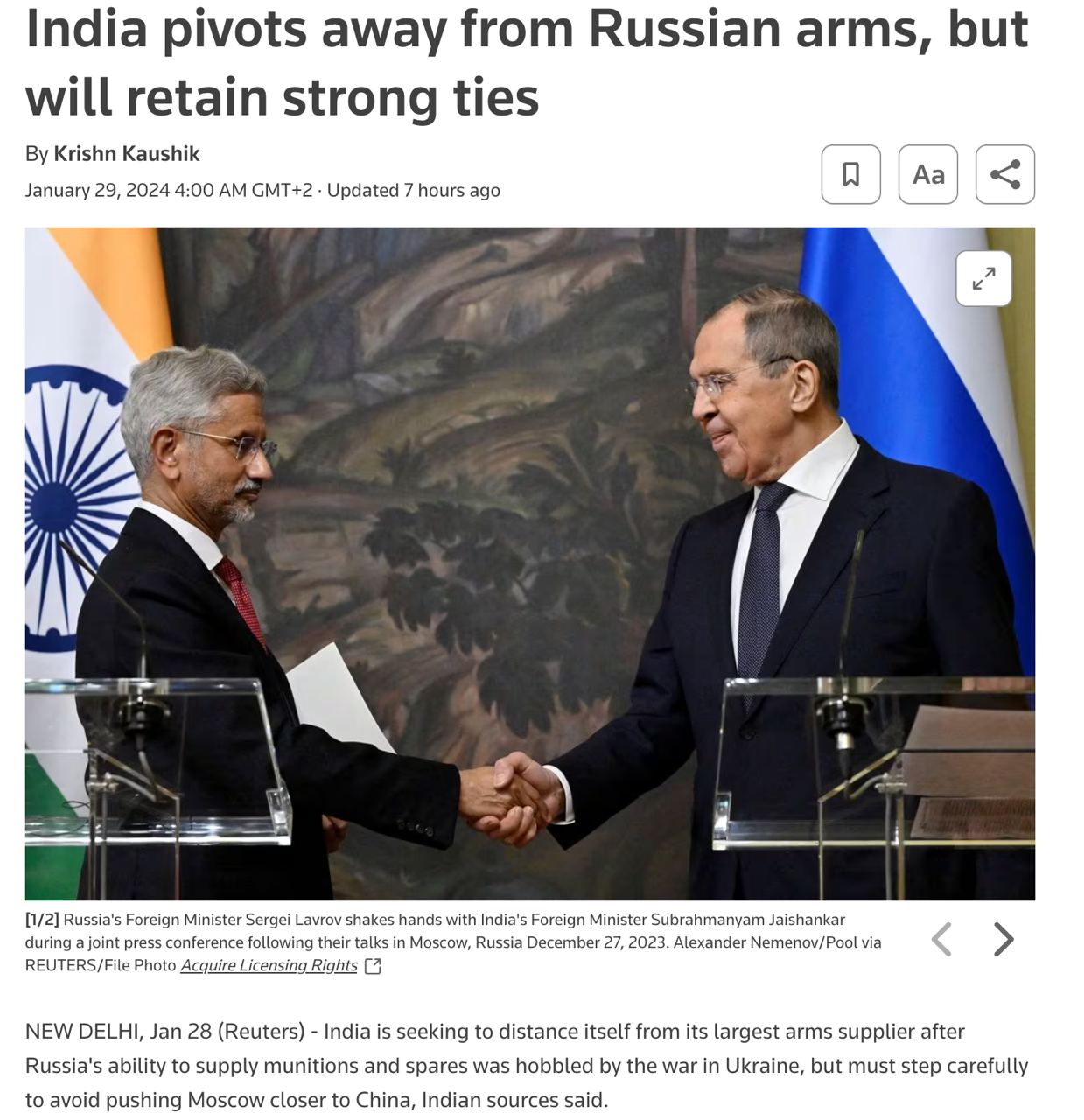 "Крупнейший в мире импортер оружия медленно поворачивается на Запад, поскольку Соединенные Штаты стремятся укрепить связи в Индо-Тихоокеанском регионе, надеясь сдержать набирающий силу Китай, отучив южноазиатскую страну от традиционной зависимости от России", - пишет Reuters.