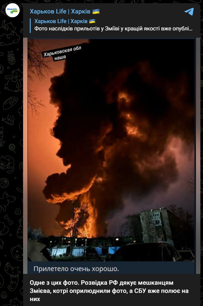 СБУ теперь ищет авторов фото, сделанного после прилета по Змиеву, пишут харьковские паблики. На кадрах виден огромный столб дыма и огня. Российские телеграм-каналы пишут о прилете по складу с топливом.