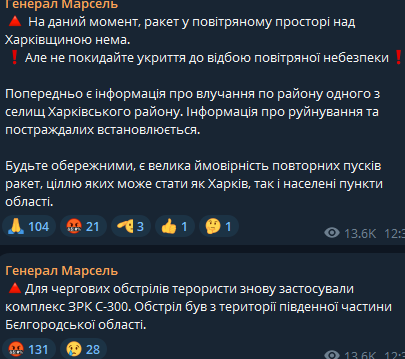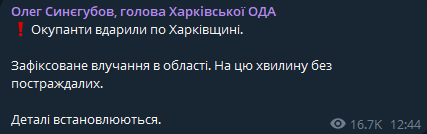 В свою очередь глава Харьковской ОВА Олег Синегубов сообщил, что "оккупанты ударили по Харьковщине. Зафиксировано попадание в области. В эту минуту без пострадавших".