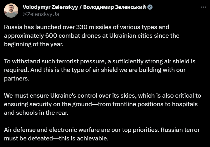 "Чтобы противостоять такому террористическому давлению, необходим достаточно сильный воздушный щит. И именно такой воздушный щит мы строим вместе с нашими партнерами. Мы должны обеспечить контроль Украины над своим небом, что также имеет решающее значение для обеспечения безопасности на земле - от позиций на передовой до больниц и школ в тылу", - написал он.