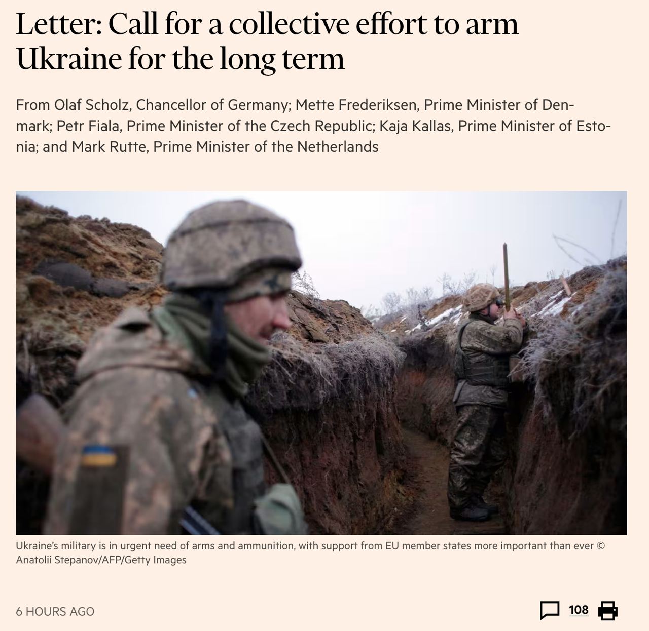 13.20 Financial Times публикует письмо лидеров Германии, Дании, Чехии, Эстонии и Нидерландов с призывом усилить военные поставки Украине.