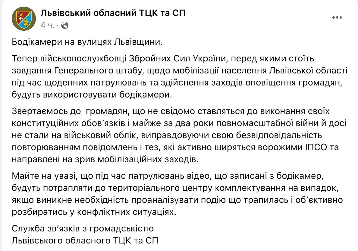 13.27 Во Львовской области военкомы теперь будут ходить с нагрудными камерами, сообщает областной ТЦК.