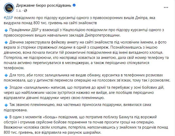 В какой-то момент "боец" сообщил, что получил серьезное ранение под Бахмутом и нуждается в деньгах на операцию. Девушка одолжила у знакомых и родственников более 800 тысяч гривен и отправила их на счет мошенницы.