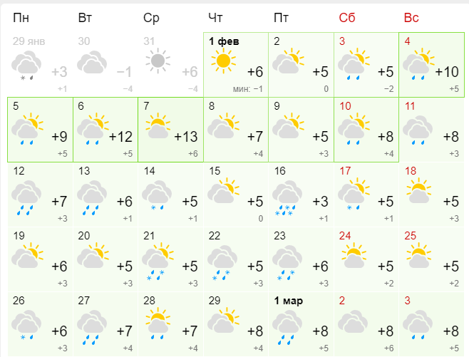 Температурный максимум ожидается 7 февраля, он составит +13.