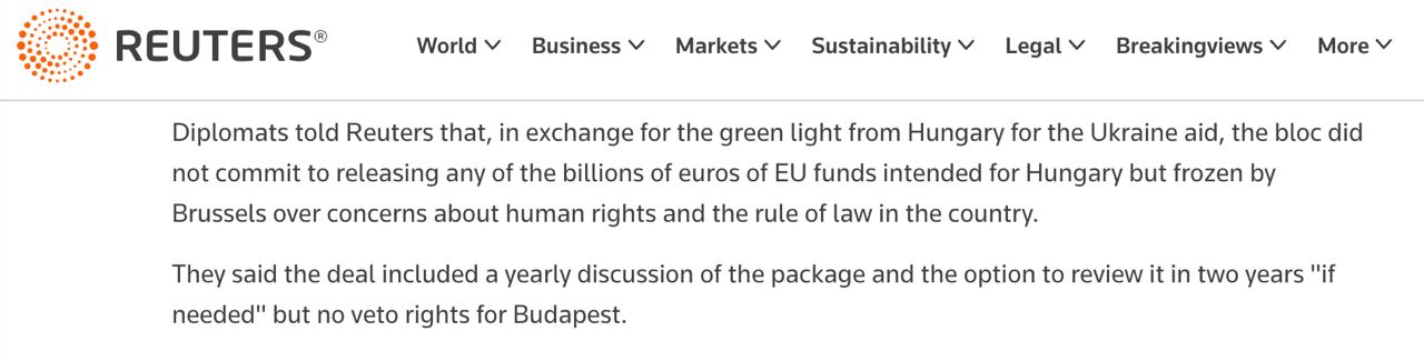 ЕС не обещал Венгрии выделить средства в обмен на голос за пакет помощи Украине - Reuters