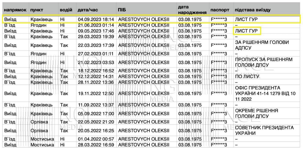Издание опубликовало скан страницы базы пересечения границы, на котором указано, что Арестович выехал из Украины 4 сентября именно на основании письма ГУР.