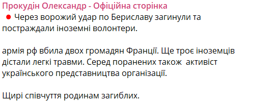 По его информации, иностранцы погибли при обстреле Берислава с использованием БПЛА около 16:00. Как уточнили в Херсонской областной военной администрации, погибшие - граждане Франции.