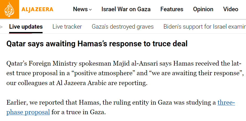 Между тем Al Jazeera пишет, что соглашение между Израилем и ХАМАС о прекращении огня в секторе Газа еще не достигнуто. Представитель министерства иностранных дел Катара Маджид аль-Ансари заявил, что ХАМАС получил последнее предложение о перемирии в "позитивной атмосфере", и "мы ждем их ответа".