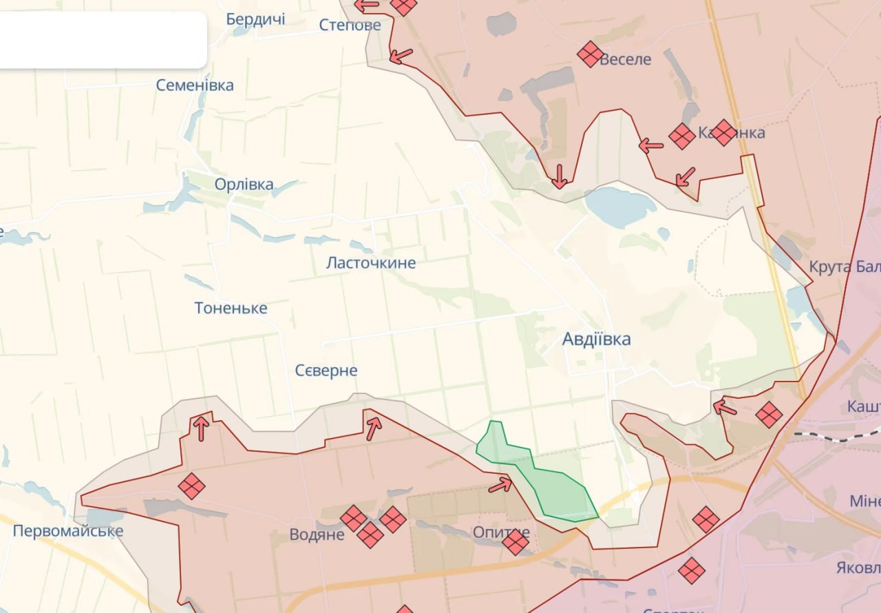Украинский паблик Deep State указывает, что РФ продвинулась на расстояние около километра со стороны деревни Веселое. По карте ресурса видно, что позиции РФ с флангов приближаются к Авдеевскому карьеру.