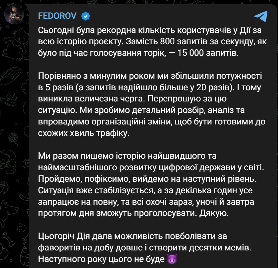 Сегодняшний сбой в приложении "Дия" глава Минцифры Михаил Федоров объяснил рекордным наплывом желающих проголосовать в национальном отборе на Евровидение.