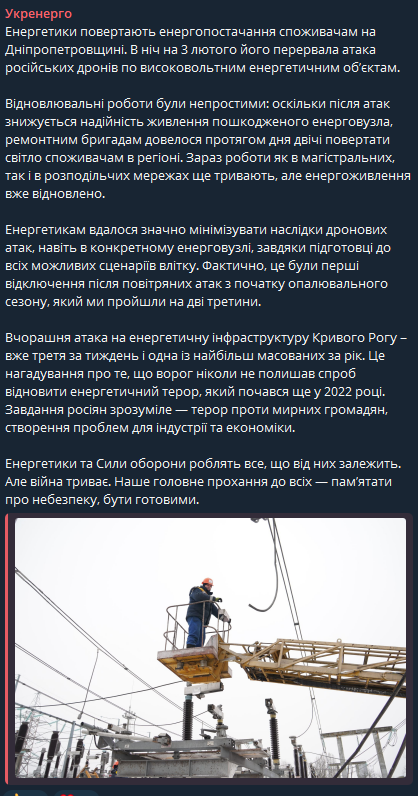 По данным компании, ремонтные работы после удара "Шахедов" в ночь на 3 февраля ещё продолжаются.