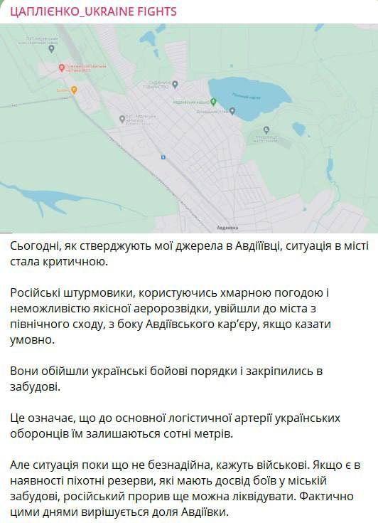 "Они обошли украинские боевые порядки и закрепились в застройке. Это означает, что до основной логистической артерии украинских защитников остаются сотни метров. Но ситуация пока не безнадежная, говорят военные. Если есть пехотные резервы, имеющие опыт боев в городской застройке, российский прорыв еще можно ликвидировать. Фактически на днях решается судьба Авдеевки", - пишет Цаплиенко.