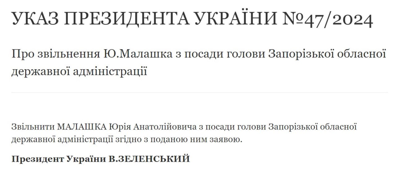 Занимавший эту должность Юрий Малашко указом президента уволен. Он был главой военной администрации с 7 февраля 2023 года.